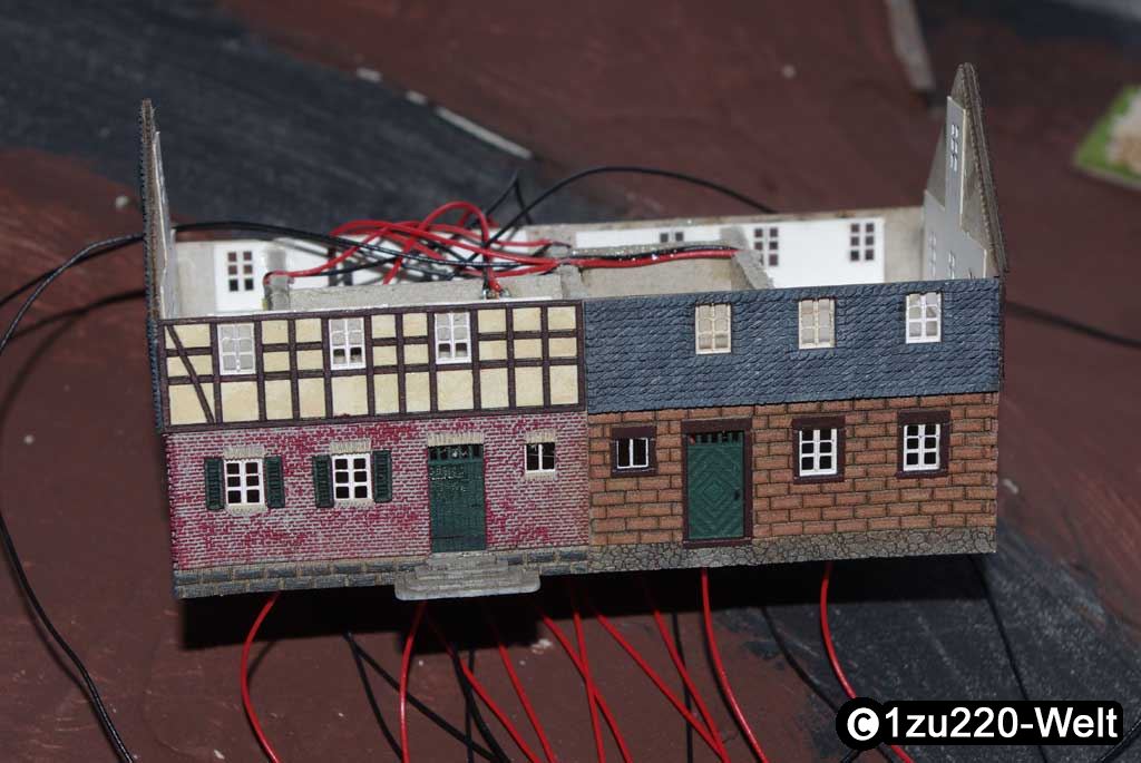 Nicht im Baubericht erwähnt wurde die Einteilung der Räume des Hauses. Diese ist mit Stückchen aus einfacher Graupappe erfolgt, um einzelne Räume gesondert beleuchten zu können. Um die verwendeten SMD-LEDs besser handhaben zu können, habe ich für die oberen Räume jeweils eine weiße 0608-LED mit einem SMD Widerstand auf ein kleines Stück Platine gelötet und mit zwei Kabeln versehen. Die Masse wird dann bereits im Haus auf einer Platine zusammengefasst und als ein Kabel herausgeführt.