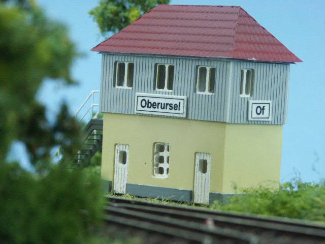 Jetzt kam das Grünzeug. Vorher wurde noch der Weg zum Stellwerk mit feinem braunen Sand gestaltet. Dann kam mein schon bekanntest grünes Gemisch auf die Gipsfläche. Auf diese Grundierung wurden dann alle anderen Gräser und Sträucher aufgeklebt. Den letzten Schliff erhielt das Diorama noch durch die größeren Bäume aus dem schon verwendeten Meerschaum.