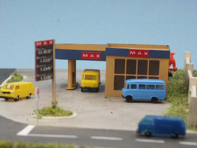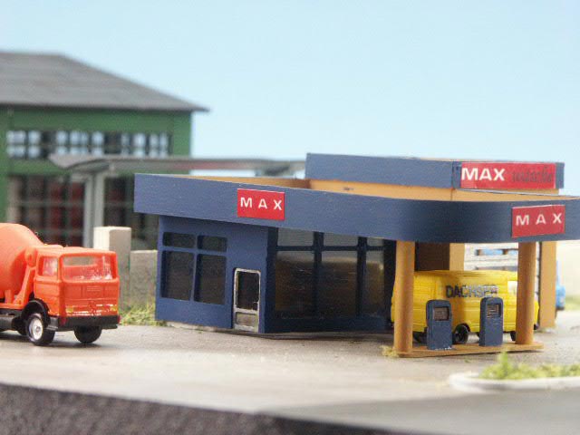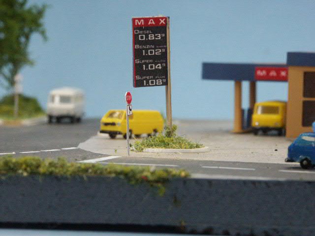 Vor Tankstellen und an Straßengabelungen ist öfters eine mit Randsteinen abgesetzte Rabatte zu finden. Die Begrenzungen auf dem Diorama habe ich durch gefräste Polystyrolteile dargestellt. In diese Beete wurden erst etwas Streumaterialreste gefüllt und diese dann mit neuem Material abgedeckt. Auch um die Gebäude habe ich etwas Dreck mit Grasbüscheln aufgetragen.
