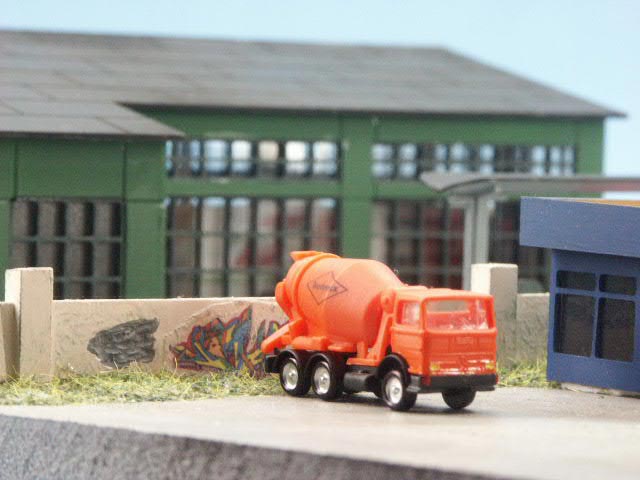 Die Grundfarbe eines Lager- und Fabrikgeländes ist grau, da der Boden meistens aus gegossenen Betonplatten besteht. Also erhielt die Platte einen Anstrich mit grauer Acylfarbe. Jetzt erfolgte eine erste Stellprobe der Gebäude. Entsprechend habe ich dann die Straßen vorgezeichnet und mit einem dunklen Grau eingefärbt. Um dem Boden ein verschmutztes Aussehen zu geben, benutzte ich schwarze Pulverfarbe zum Altern. An der Stelle, wo die Halle steht, ist es durch Öl und Staub meist dreckiger. Auch das wurde durch etwas mehr Pulver realisiert.