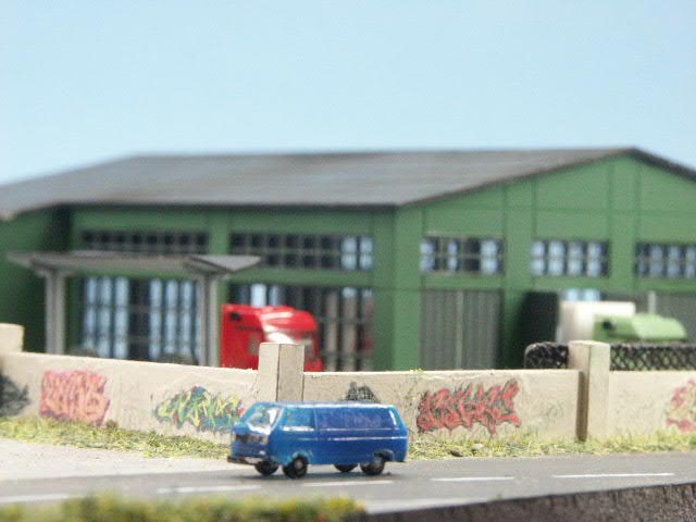 Als Trennung zwischen den beiden Gebäuden, die gleichzeitig als Umfriedung des Busdepots dient, ist aus 2mm dicken Polysytyrolstreifen eine Mauer entstanden. Die Pfosten wurden durch Aufeinanderkleben von 2 Streifchen erstellt. Das Tor ist aus 1mm Messingstangen gebogen und verlötet. Auf das Gestell habe ich dann Messinggewebe als Maschendrahtnachbildung aufgelötet.