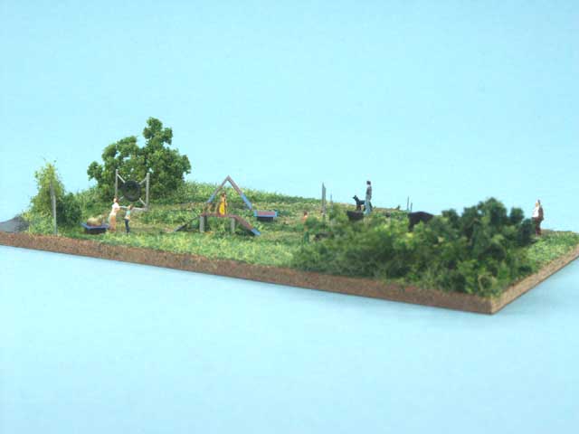 Darauf wurde eine Grundierung aus feinen dunkelgrünen Flocken aufgetragen, und die Geräte in Form eines kleinen Parcours aufgeklebt. Die späteren Wege zwischen den Geräten wurden wieder mit Wasser getränkt, welches den Leim anlöst. So kann man die Flocken wieder leicht entfernen. Die Lücken wurden dann mit feinem braunen Sand aufgefüllt, um das zertrampelte Land zu imitieren.