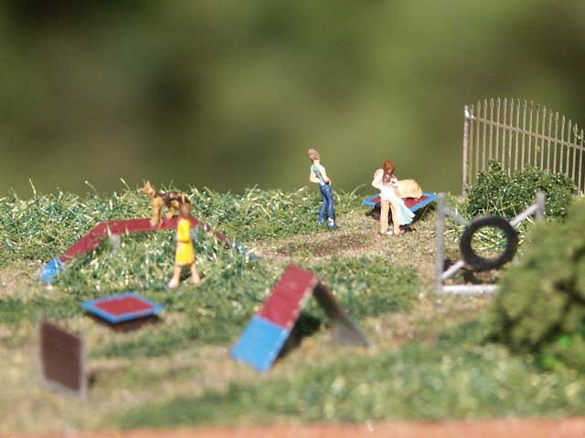 Zwischen den Geräten und an den Rändern bilden groben Flocken und Meerschaum die übliche Vegetation nach. Quer an einer Ecke entstand eine kleine Straße, die mit einem Zaun zum hin Platz abgetrennt ist. Als letztes fanden noch die Hunde und ihre Herrchen und Frauchen ihren Platz auf das Diorama. Diese Figuren habe ich bei Trafofuchs.de erworben.