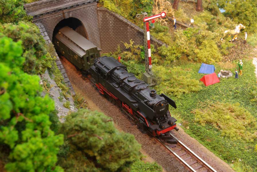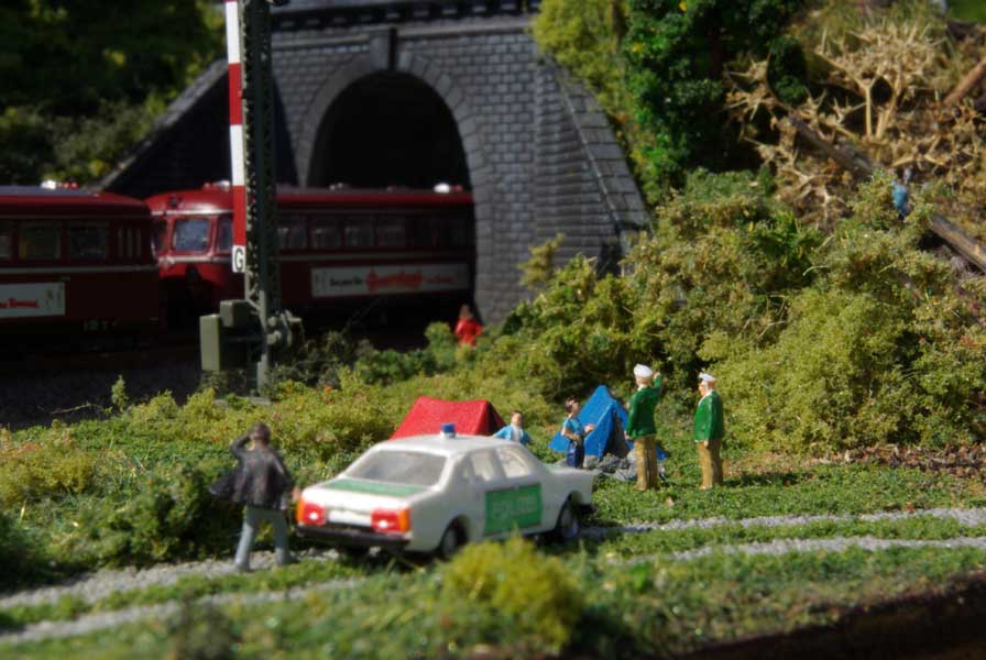 Als kleiner Eye-Catcher habe ich mit dem Stemmeisen noch etwas Felsen im Anschluss an die Stützmauer des Tunnels geschnitzt. Nach dem Färben in grau wurde mit kleinen Steinchen und Schotter etwas Geröll nachgebildet und ein paar Büsche und Gras gepflanzt. Auch der Weg im Vordergrund wurde mit fein gemahlenem Schotter aufgeklebt. Danach erfolgte der übliche Auftrag von grünem Streumaterial in verschiedenen Größen und Färbungen.