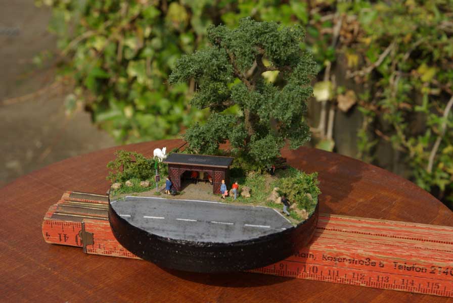 Den Abschluss bilden die Figuren (irgendwann mal ein Paket bei ebay gefunden), das Schild (bedrucktes Papier, 0,3mm Draht) und ein paar kleine Grasbüschel am Straßenrand (Kleckse Weißleim mit Flasche begrast).