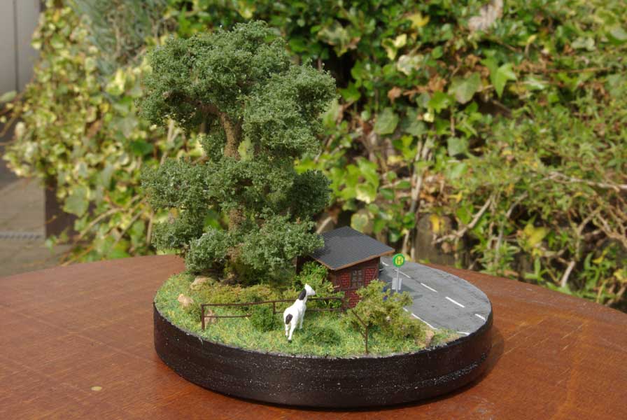 Das niedere Gebüsch ist dann wie immer aus gröberen Flocken und begrüntem Seemoos. Den Baum habe ich irgendwann mal von einem Bekannten bekommen, der hat dann den Ehrenplatz hinter dem Häuschen erhalten. Die Bank unter dem Baum ist mit Sekundenkleber und Balsaholz zusammengeklöppelt. Danach braun lackiert und mit gelb und grünen Pulverfarben gealtert.