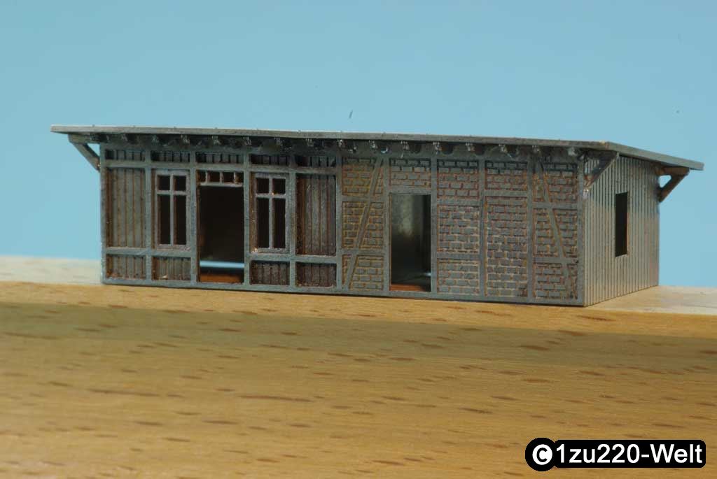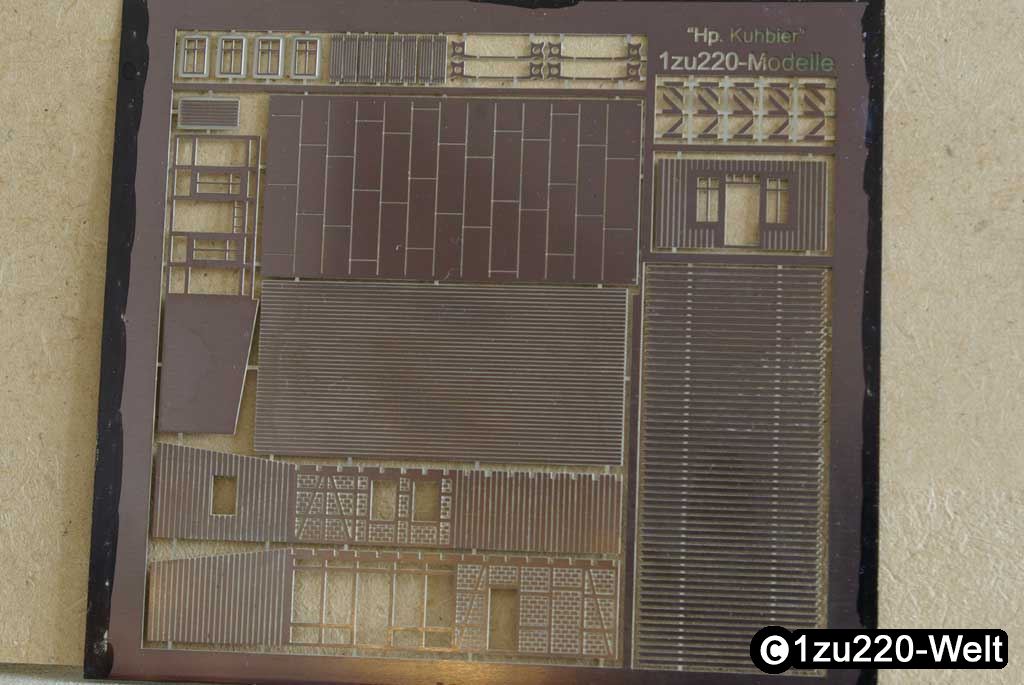 Anders als im Magazin habe ich das Modell jedoch nicht in Kunststoffbauweise und Handarbeit umgesetzt, sondern einen Ätzbausatz daraus gemacht. So können alle Strukturen fein und sauber nachgebildet werden. Bautechnisch stellte der Eingangsbereich zur Wartehalle die größte Herausforderung dar. Dort liegt das Fachwerk außen offen und musste in entsprechender Dicke ausgebildet werden. Dazu habe ich dort drei Schichten Blech verwendet. Die äußere Lage ist in die Grundwand integriert und zeigt nur die Balken des Fachwerks, die nächste Schicht beinhaltet zusätzlich die Fensterkreuze und mit Knicklinie versehen die Zwischenwand. Die dritte Schicht verschließt das Fachwerk von innen mit einer Bretterstruktur. Etwas aufwändig, aber nur so erhält man eine schöne Tiefenwirkung.