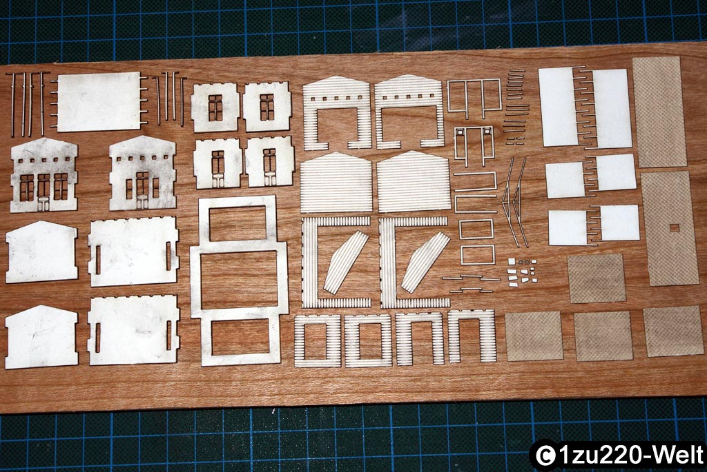 Dieses Modell hat jedoch gezeigt, dass grundsätzlich alle Strukturen und Stege in dieser Feinheit machbar sind, also konnte die Zeichnung als Grundlage genommen und nur Fehler und Verfeinerungen mussten mit eingeplant werden. So wurden z.B. die Fenster der Straßenseite dem Vorbild angepasst, das Dach erhielt einen Unterbau aus Sparren und Pfetten und es wurde der zuvor vergessene Schornstein ergänzt. Das neue Modell in Teilen sieht dann wie folgt aus:
