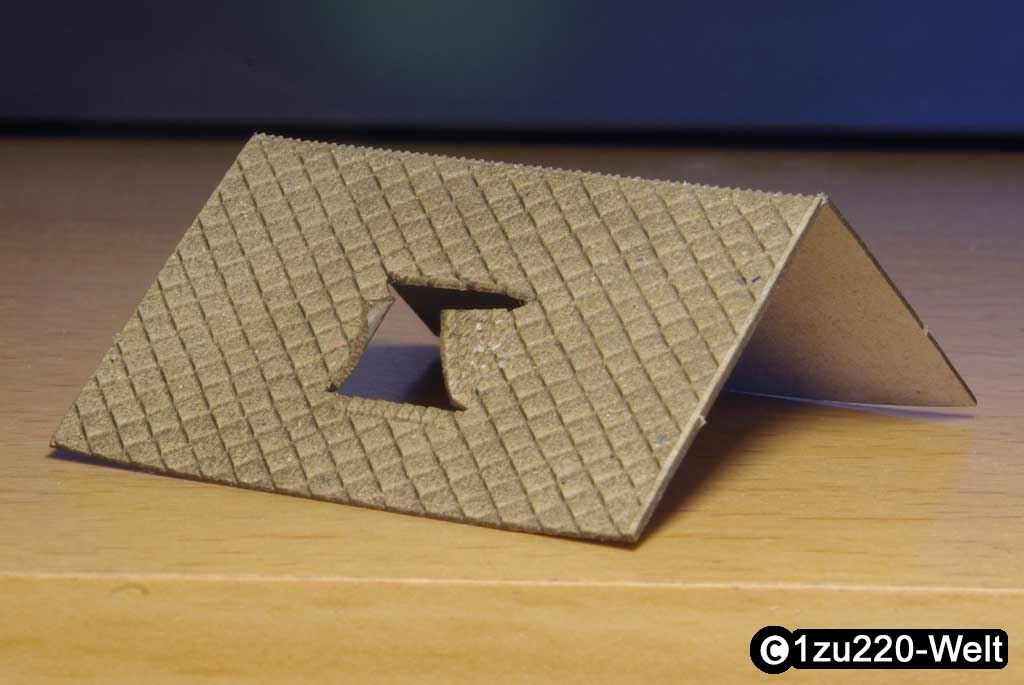 Jetzt musste das Dach noch seine Farbe erhalten. Ich habe mich bei der einen Hälfte für dunkelgrauen Schiefer entschieden und die andere mit Tonziegeln eingedeckt. Dabei erfolgte der Farbauftrag in folgender Reihenfolge: