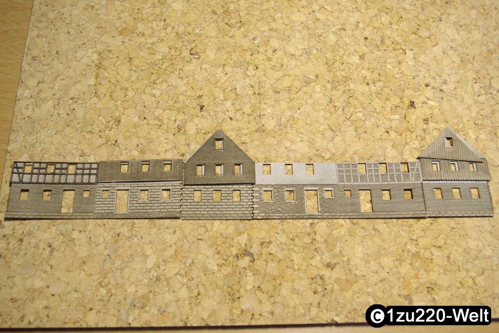 Ein erstes Zusammenhalten der Wände ergab, dass die Verbindungen bei diesem Modell genau gearbeitet sind, bei der Scheune vom selben Hersteller waren z.T. größere Lücken. Die Ausklinkungen entsprechen dieses Mal exakt der Materialstärke. Die feinen Verzahnungen der Ziegelsteine sind jedoch teilweise komplett weggebrannt. Am fertigen Modell fällt dies jedoch nicht auf.